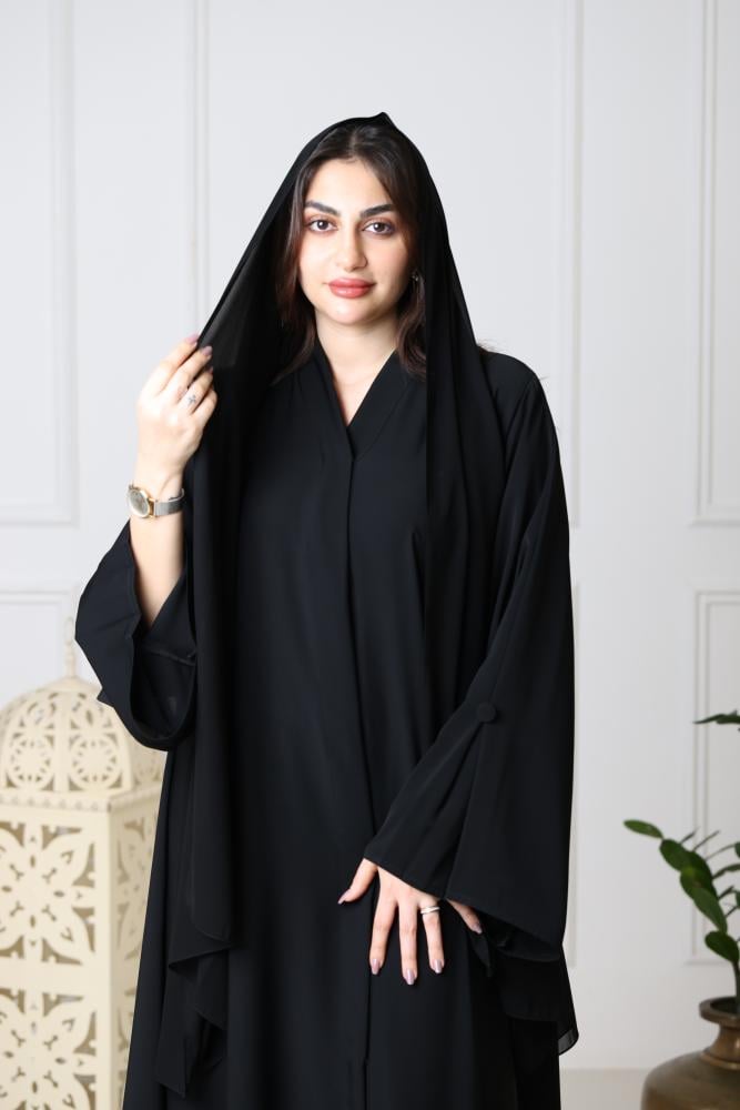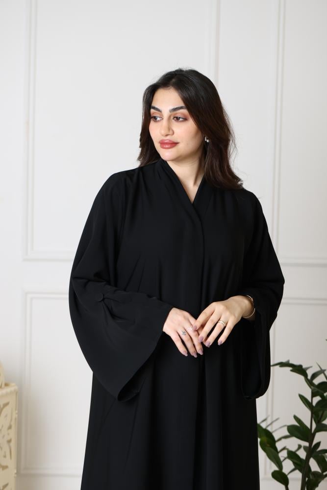 Additions: A soft, feminine design with a comfortable and practical V-neck, front pleats on the sleeves and a back pleat on the back of the abaya, with button inserts on the sleeves and back of the abaya for the pleat.